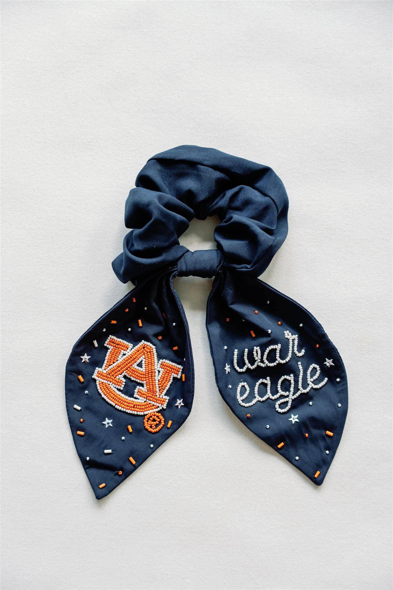 This adorable navy Auburn beaded scrunchie is perfect for Auburn fans of all ages! The scrunchie has two trailing ribbons with the Auburn logo and "war eagle" beaded on them.