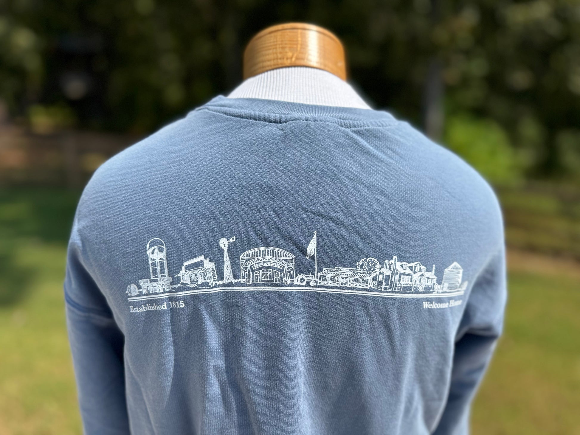 Warm up in this cool new color! Our Blue jean Comfort Colors lightweight crew neck sweatshirt is great for cool nights on the beach or the lake! The townscape of Pike Road and lettering is applied in white.