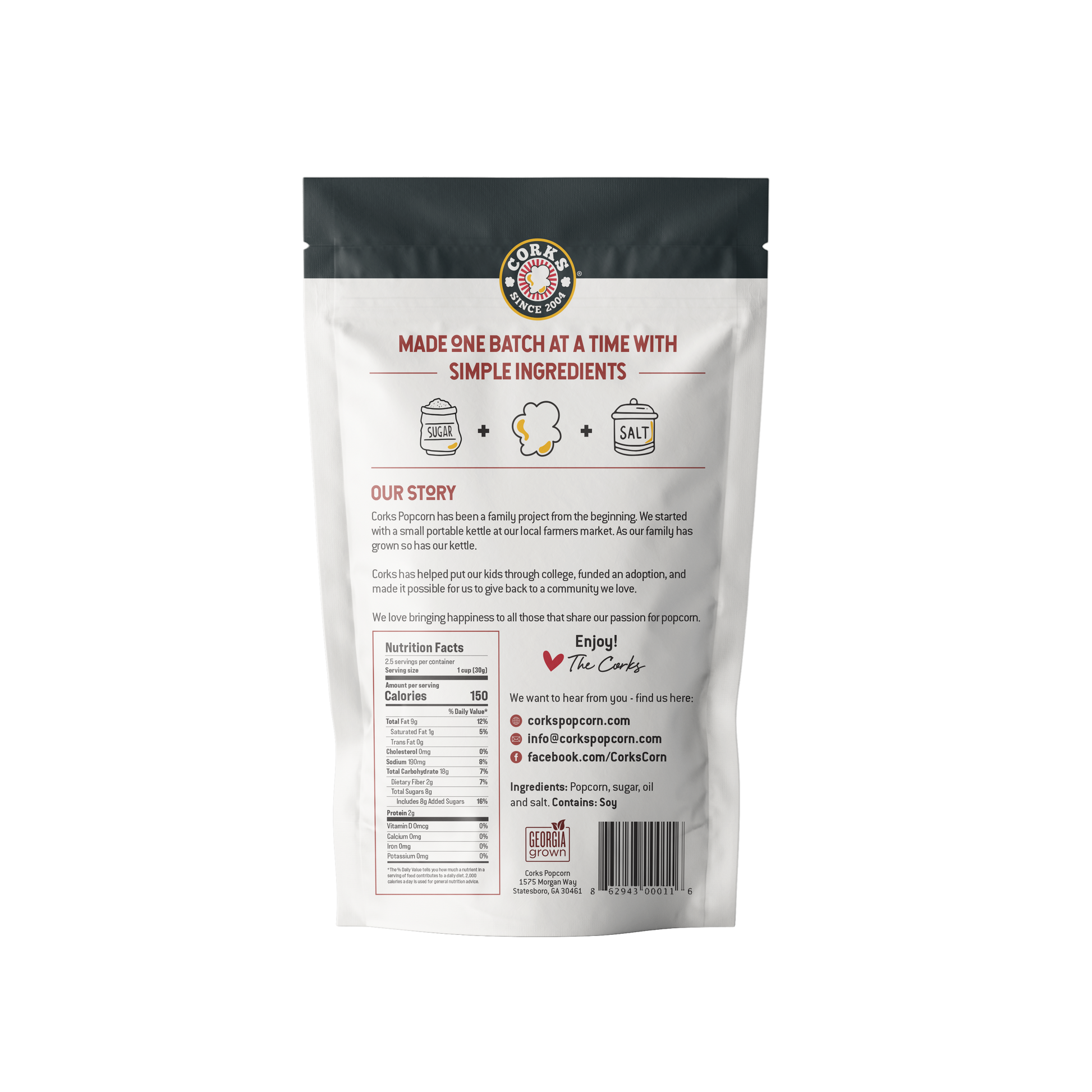 Our original sweet and salty Kettle popcorn is handcrafted in small batches which are made fresh to order. The Kettle popcorn is oil-popped with premium, non-GMO, mushroom kernels that ensure large and fluffy popcorn, and lock in that authentic kettle corn taste. Popped in a sugar base with the perfect sprinkle of salt - our kettle corn stands out among other popcorn companies.