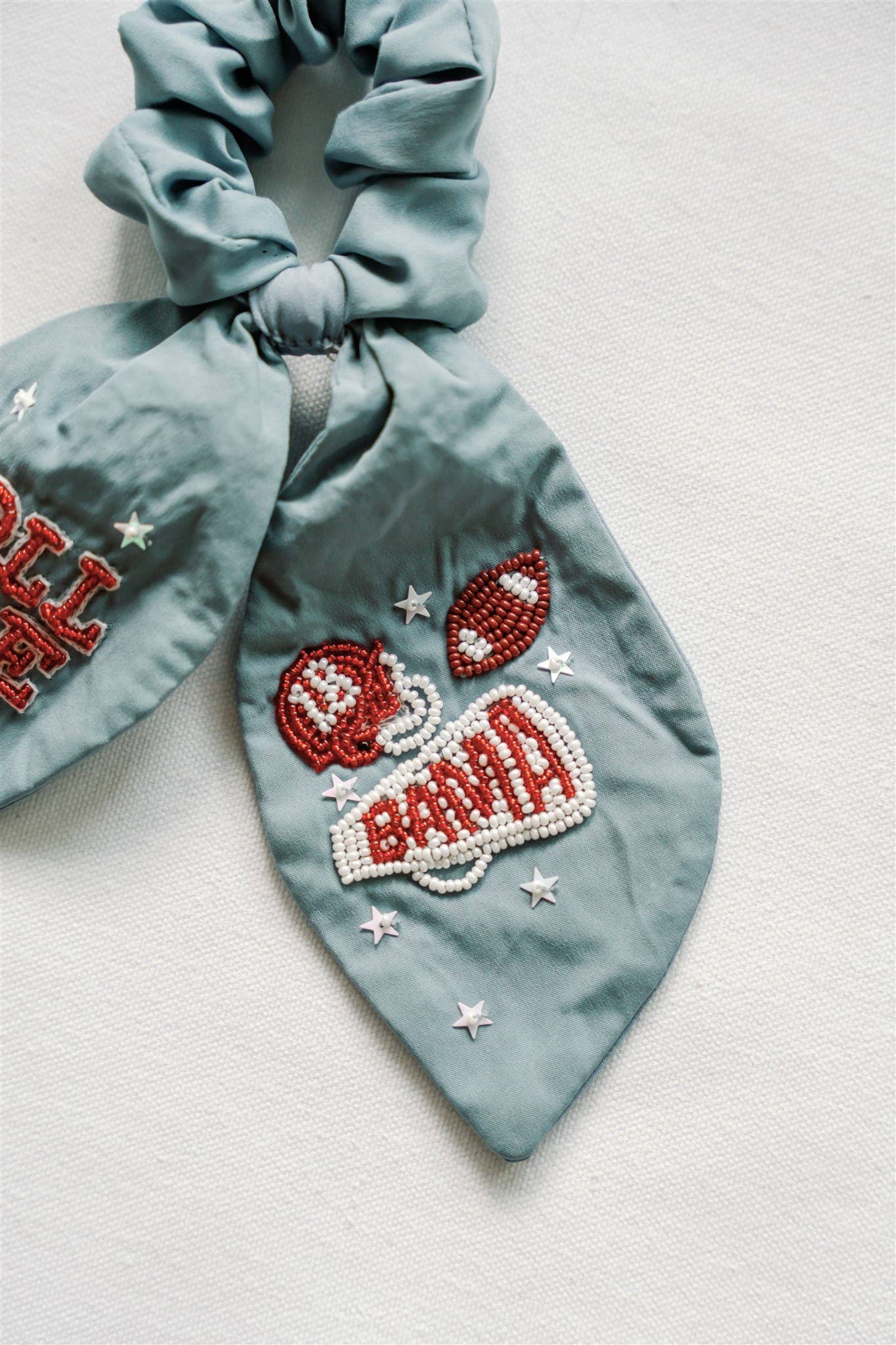 OFFICIALLY LICENSED BY THE UNIVERSITY OF ALABAMA This adorable grey Alabama beaded scrunchie is perfect for Bama fans of all ages! The scrunchie has two trailing ribbons with the Alabama helmet, megaphone, football, and "Roll Tide" beaded on them.